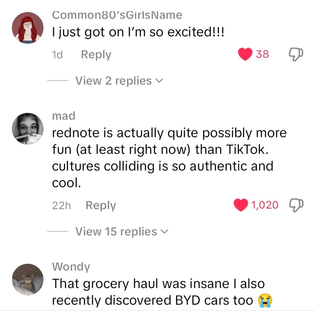 I've downloaded RedNote as well (along with users from other countries like the UK, Ireland, Australia, Germany, Scotland, etc), just to lurk and continue to observe this enemies-to-lovers plot twist.