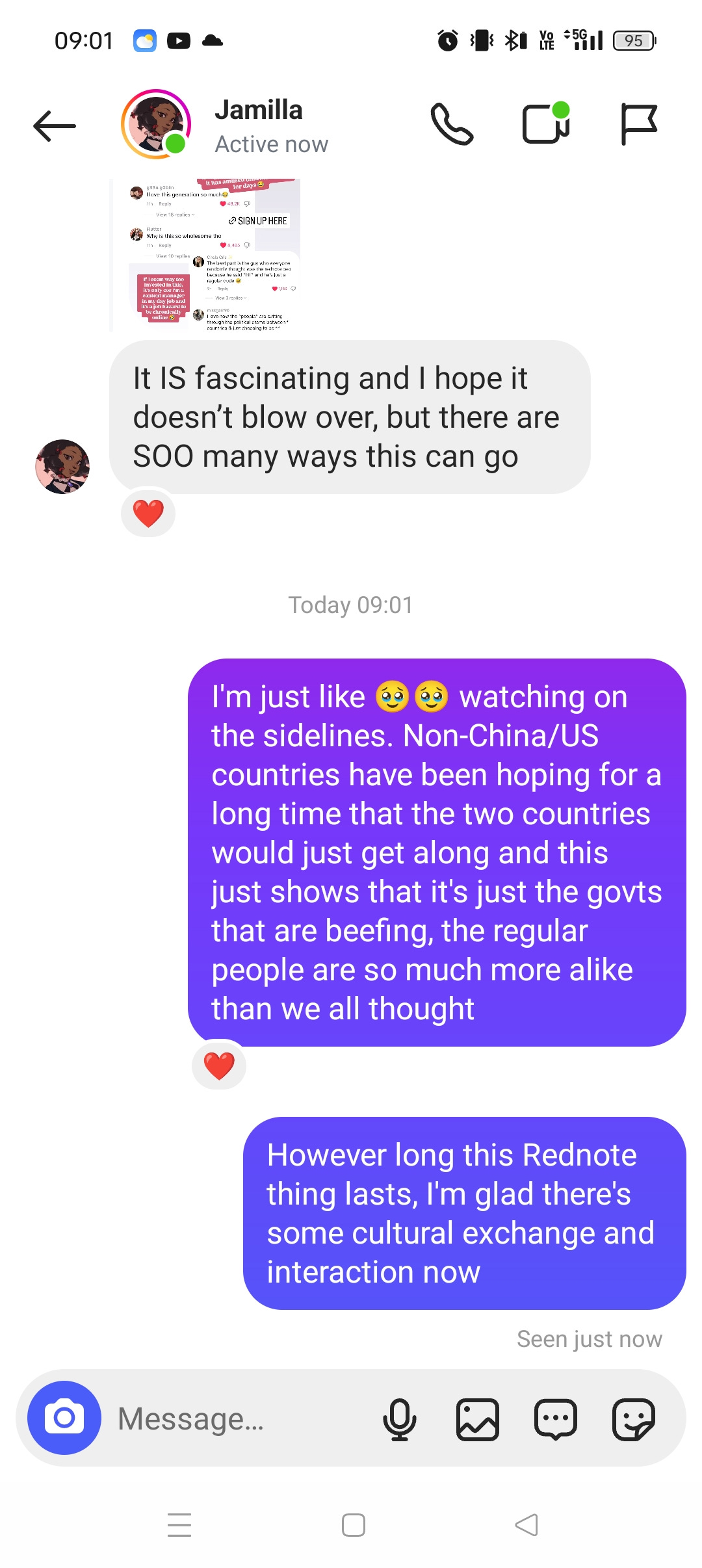 Americans and Chinese folks getting along on a Chinese app (trading cat photos, helping each other with their homework, busting myths about their countries, sharing makeup and fashion tips, exchanging pictures of their school lunches (one American girl shared her gooey brown slop and a Chinese user commented, "No offence, but it looks like something my grandma feeds her ducks", to which OP replied, "Well then your grandma's ducks probably eat better than us"), having open conversations about both frivolous and hard-hitting topics, breaking sociocultural barriers and getting to know each other on a deeper level than they had in decades) was not on my 2025 bingo card, but here we are.